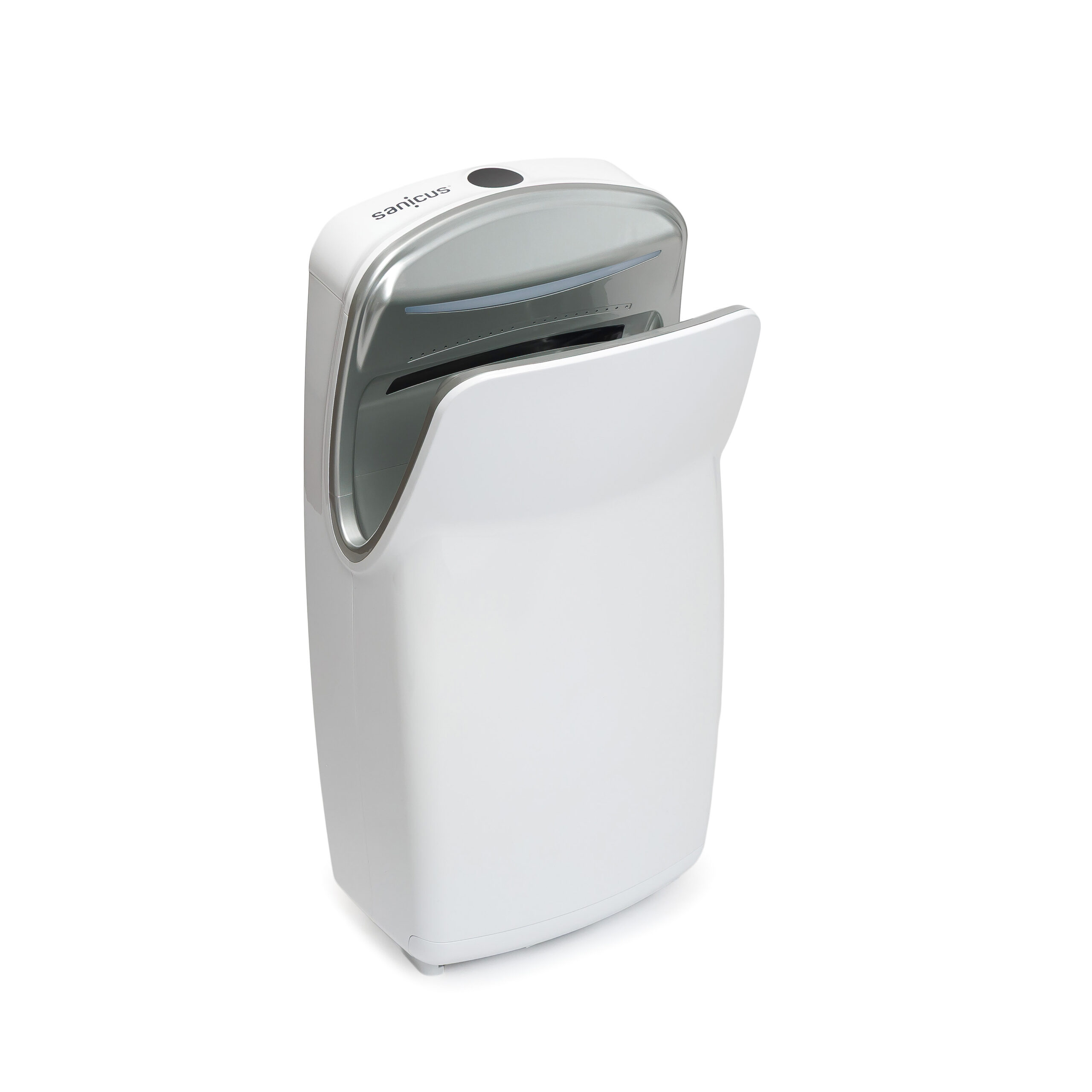 Die hohe Geschwindigkeit des Luftstromes trocknet die Hände angenehm und effizient, unter aktiver Beteiligung des Benutzers. Ein Kontakt der Hände mit dem Trockner ist nicht nötig. Das Händetrocknergehäuse ist aus antibakteriellem Kunststoff gefertigt. Durch den Sanicus- R1.1 Händetrockner verhindern Sie Papierabfälle und helfen außerdem, seine Umgebung sauber und ordentlich zu halten.